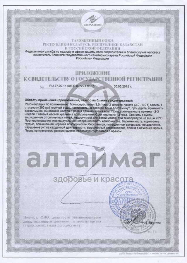 2 фильтр-пакета по (3,0-4,0 г) залить 1 стаканом (200 мл) горячей воды, настоять на водяной бане 15-20 минут, процедить, принимать взрослым по 1/3 стакана 3 раза в день во время еды. Готовый настой хранить в холодильнике.