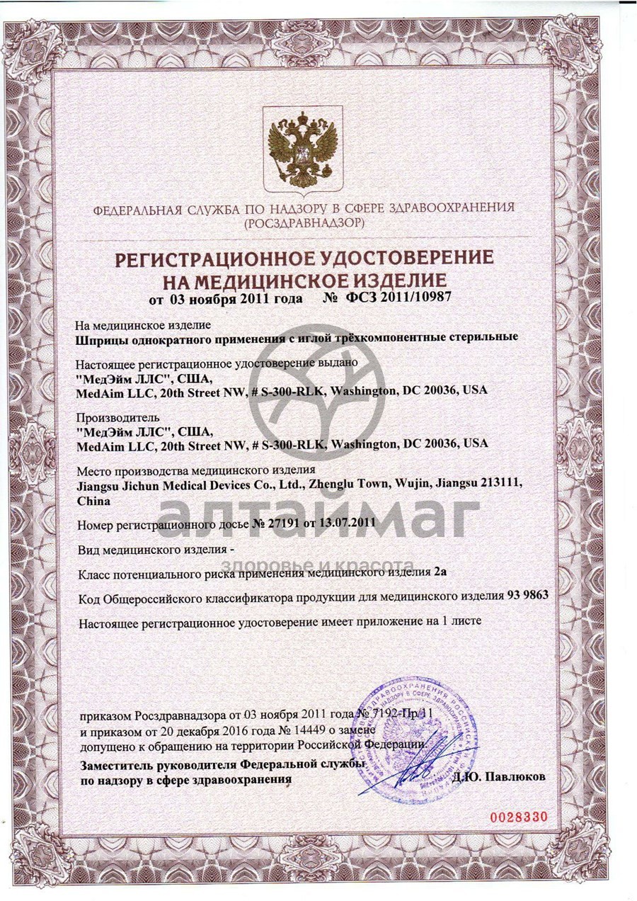 Шприц инъекционный однократного применения с иглой трёхкомпонентный, без латекса.